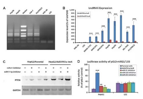 qRT-PCR檢測顯示,AdSVPE1a-lncR–mediated lncRNAi表達水平在Huh-7,Hep3B和HepG2細胞中比較高,在PLC/PRF/5, MHCC97H, BEL-7402,MHCC97L, and SMMC-7721相對比較低,而在WRL-68和L02細胞中很低。那么,lncRNAi是否可以影響下游miRNA及靶基因表達呢?結(jié)果顯示,miR21和miR17-5p在HepG2細胞中顯著抑制,相應的靶基因PTEN有明顯上調(diào)。進一步的熒光素酶檢測也表明pGL3-miR21/17-5p在HepG2相比L02細胞表達明顯低。因此,lncRNAi可以抑制OncomiRs來保護下游靶基因。