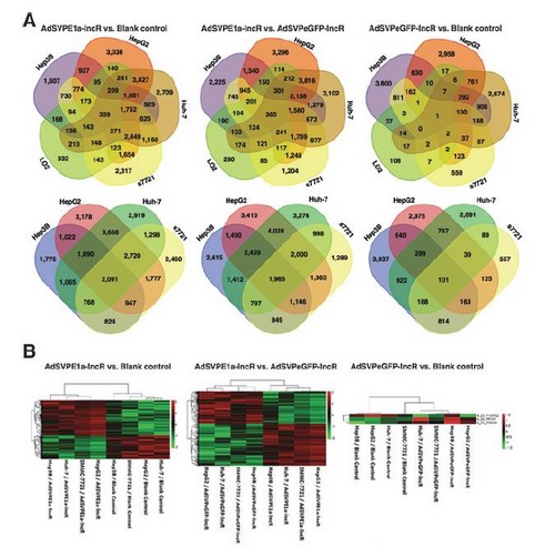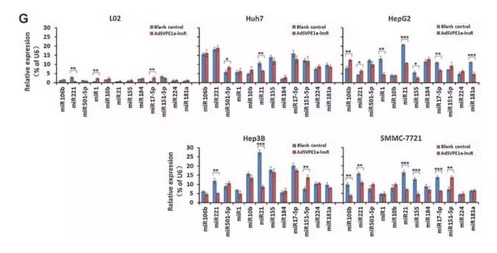 AdSVPE1a-lncR感染后mRNA發(fā)生變化,miRNA是否也有變化呢?通過全基因組miRNA表達譜芯片檢測,研究人員發(fā)現(xiàn)HCC細胞中有大量的miRNA表達發(fā)生改變。