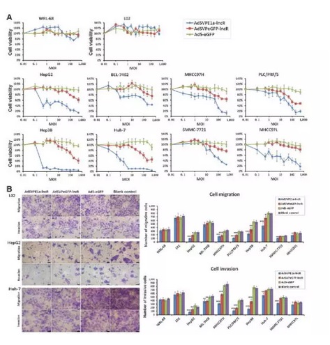 lncRNAi在細胞中能起作用,那么會影響哪些細胞的生物學功能呢?結(jié)果顯示,AdSVPE1a-lncR有非常顯著的Hep3B和Huh-7細胞殺傷能力。在Hep3B細胞中加入MOI=0.5 pfu/cell ,細胞存活不到50%,加入MOI=2 pfu/cell,細胞存活不到10%。在其他細胞系,HepG2,MHCC97L,PLC/PRF/5,MHCC97H和SMMC-7721細胞在加入MOI=100 pfu/cell時,存活也少于50%。但是,對BEL-7402細胞的細胞殺傷卻不顯著,對正常肝細胞系沒有顯著殺傷力。因此,lncRNAi只有對腫瘤細胞具有殺傷力,影響其增殖能力。細胞遷移和侵襲能力檢測也表明,AdSVPE1a-lncR能顯著抑制HepG2, MHCC97H, PLC/PRF/5, Hep3B, Huh-7細胞的遷移和侵襲能力,而在BEL-7402, SMMC-7721, MHCC97L細胞中的抑制能力相對較弱。因此,lncRNAi顯著抑制了腫瘤細胞的遷移和侵襲能力。