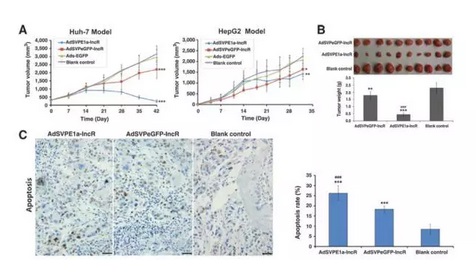 細胞實驗表明lncRNAi確實對腫瘤細胞產(chǎn)生效果,芯片檢測也表明改變的基因和miRNA也確實和增殖凋亡相關。那么,這樣的效果在體內(nèi)是否也一致呢?將AdSVPE1a-lncR治療后的Huh7和HepG2細胞移植裸鼠,21天后,治療組腫瘤體積減小。同時,Huh-7細胞移植模型的腫瘤質(zhì)量在治療后也明顯低于對照。