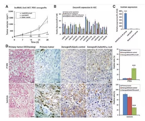 為了更進一步的確認體內(nèi)作用效果,研究人員用病人樣本的PDX小鼠模型進行了實驗。結(jié)果顯示,治療28天后,腫瘤質(zhì)量顯著減少。治療后,miRNA的靶基因PTEN表達顯著增加,Survivin表達顯著降低。因此,基于AdSVPE1a-lncR的lncRNAiHCC腫瘤治療確實能夠起到作用效果,是一種潛在的HCC治療方法。