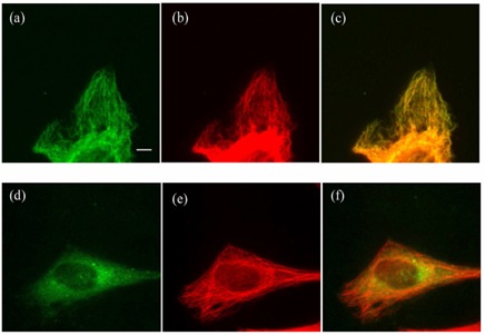 (a) 以多步法策略獲得的量子點(diǎn)-微管蛋白偶聯(lián)物在Hela細(xì)胞成像;(b) 以微管蛋白抗體對(duì)(a)圖細(xì)胞進(jìn)行免疫細(xì)胞染色成像;(c) (a)及(b)的疊加;(d) 未偶聯(lián)的量子點(diǎn)在Hela細(xì)胞成像;(e) 以微管蛋白抗體對(duì)(d)圖細(xì)胞進(jìn)行免疫細(xì)胞染色成像;(f) (d)及(e)的疊加。