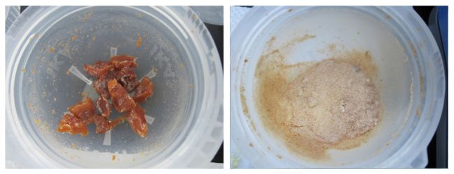 在實(shí)驗(yàn)室前處理過程中,我們常常會遇到一些難以處理的樣品,水分含量高的、油性的,譬如糖果、巧克力,蜜餞等。如果直接研磨,高速運(yùn)轉(zhuǎn)的馬達(dá)會帶來溫度的上升,往往使得這些樣品出現(xiàn)粘結(jié)、團(tuán)聚的情形(圖片所示為杏干)。