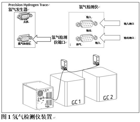 可以與 Precision Hydrogen Trace 氫氣發(fā)生器一起購買一臺氫氣檢測裝置。檢測儀的目的在于與 GC 結合使用。建議將檢測儀放置在 GC 出口高度的上方。檢測儀可以進行壁式安裝。如下圖所示,裝置從檢測儀后部的“輸入”端口與發(fā)生器后部的“氫氣檢測儀”端口相連(圖 1)。