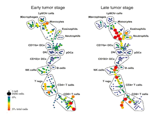 圖一中展示的是不同時(shí)期的小鼠黑色素瘤中浸潤(rùn)的免疫細(xì)胞SPADE圖譜,可以明顯的看出單核細(xì)胞比例明顯增大。
