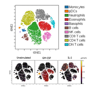 圖二是根據(jù)16個(gè)胞外標(biāo)志蛋白表達(dá)數(shù)據(jù),對(duì)外周血白細(xì)胞進(jìn)行viSNE分群結(jié)果。可以看出,在viSNE圖譜中,幾個(gè)主要免疫亞群各自聚群。同樣,我們也可以以“熱圖”的方式展示不同刺激條件下pSTAT5在各個(gè)亞群中的變化情況。(Adeeb H et al, 2015)