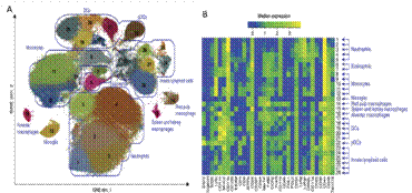 圖三、小鼠不同組織中髓系細(xì)胞的組成(A viSNE圖譜;B 計(jì)算機(jī)識(shí)別的各個(gè)亞群的表型分析;數(shù)據(jù)來(lái)源Nat Immunol. 2014 Dec;15(12))