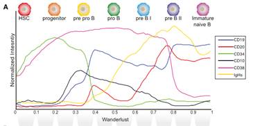 Wanderlust會(huì)根據(jù)每個(gè)細(xì)胞排列的位置賦予給細(xì)胞一個(gè)Wanderlust值,其大小就反映了分化程度:0代表起點(diǎn)(造血干細(xì)胞),1代表終點(diǎn)(Immature Naïve B),該數(shù)值越小說(shuō)明細(xì)胞越原始;