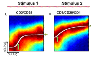 這里要用到的是一個(gè)名為DREVI的分析方法,它可以幫助我們從單細(xì)胞數(shù)據(jù)中提取出兩個(gè)信號(hào)通路蛋白之間的“函數(shù)關(guān)系”,并用一系列參數(shù)對(duì)這種關(guān)系進(jìn)行量化。下圖I,II展示的是在不同的刺激條件下pCD3ζ和pSLP76之間的關(guān)系曲線。我們可以很容易看出,在第二種刺激條件下,較低的pCD3ζ水平就可以啟動(dòng)SLP76磷酸化,同時(shí)pSLP76也可以達(dá)到更高的水平。