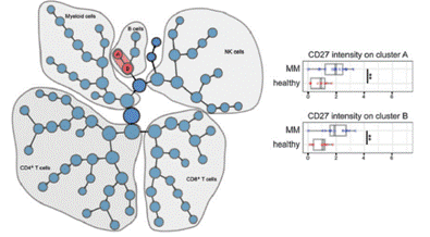 斯坦福大學(xué)的研究人員用質(zhì)譜流式檢測(cè)了多發(fā)性骨髓瘤病例和正常人外周血細(xì)胞39個(gè)蛋白的表達(dá)。為了尋找兩組樣本之間存在顯著差異的Bio-Marker,他們引入了Citrus分析。首先通過(guò)其中的24個(gè)表面Marker聚類(lèi)分成幾十個(gè)亞群,然后通過(guò)對(duì)比各亞群中14個(gè)蛋白的表達(dá),最終發(fā)現(xiàn)了圖中所示的兩個(gè)B細(xì)胞相關(guān)亞群(Cluster A 和Cluster B),在這兩個(gè)亞群中,CD27在多發(fā)性骨髓瘤病人組的表達(dá)量要明顯高于正常人。這一差異有希望做為該類(lèi)疾病的一個(gè)BioMarker用于疾病的診斷。
