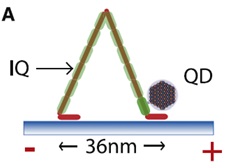 基于量子點的單分子熒光示蹤技術,對于體外研究分子馬達在細胞骨架上的行走模式具有重要意義。目前對于細胞內(nèi)分子馬達運動特性的研究,是通過對內(nèi)吞體、黑素體等細胞器的示蹤而間接實現(xiàn)的。這些細胞器通過分子馬達運輸,因此,對細胞器的運動監(jiān)測可間接分析分子馬達的運動特性。巴黎第六大學Giovanni Cappello課題組,利用量子點標記肌球蛋白(Myosin V)并遞送入細胞內(nèi),在單細胞水平、以高時間和高空間分辨率記錄了肌球蛋白在微絲骨架上的運動特性。