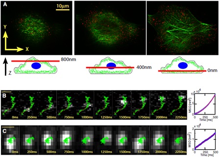 (B) 量子點標記肌球蛋白(銀灰色亮點)沿著微絲骨架(綠色)定向運動。