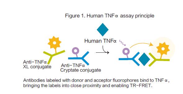 HTRF是由Cisbio試劑公司研發(fā)的多功能技術,用于檢測生物分子間相互作用。它結合了熒光共振能量轉移(FRET)技術和時間分辨熒光(TRF)技術,實現(xiàn)消除半衰期短的背景熒光。這個實驗應用供體和受體熒光染料。當供體和受體之間足夠近的情況下,由光源(如,高能閃爍氙燈)照射產(chǎn)生的供體激發(fā)光就會通過能量轉移機制到受體,反過來作為受體的特定激發(fā)波長。HTRF采用四個特定的熒光染料,可以組合成兼容的供體-受體TR-FRET對。供體為銪元素(Eu3+)和鋱元素(lumi4™- Tb),其長壽命熒光使它們可以應用在時間分辨熒光實驗中。兩種受體已經(jīng)被研發(fā)用于HTRF實驗,分別是, XL665 and d2。都具有激發(fā)光譜重疊的HTRF供體的發(fā)射光譜。每個都在665nm有一個發(fā)射峰,但這個區(qū)域的波長并不能激發(fā)供體,或者激發(fā)非常弱。最早期的的HTRF受體,XL665,來源于紅藻的藻膽蛋白色素的純化。第二代受體,d2,是一種改進的別藻藍蛋白,比XL665小100倍,用來緩解可能發(fā)生在XL665檢測時的空間位阻問題。