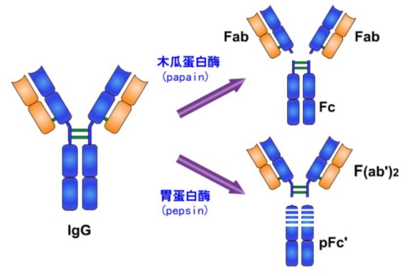 IgG可被胃蛋白酶分解為兩個片段,一個Fab雙體,稱F(ab')2,能和兩個相同的抗原結合;另一片段類似Fc,隨后被分解成小分子多肽,無生物活性。
