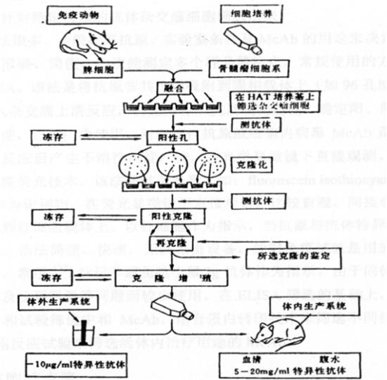 Köhler和Milstein在1975年建立了體外淋巴細胞雜交瘤技術,用人工的方法將產(chǎn)生特異性抗體的B細胞與骨髓瘤細胞融合,形成B細胞雜交瘤,這種雜交瘤細胞既具有骨髓瘤細胞無限繁殖的特性, 又具有B細胞分泌特異性抗體的能力, 由克隆化的B細胞雜交瘤所產(chǎn)生的抗體即為單克隆抗體