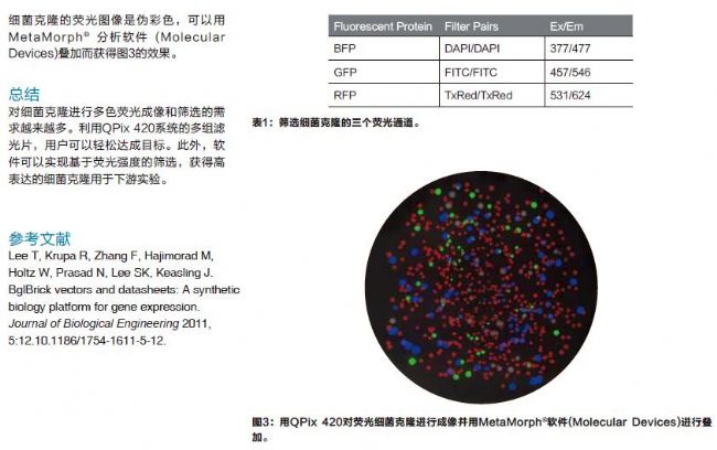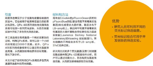 細菌篩選常見于分子克隆構(gòu)建重組細菌的實驗中。它也被用于檢測特定蛋白質(zhì)的表達和活性。QPix 400系列微生物克隆篩選系統(tǒng)可檢測一系列熒光波長,從而在細菌實驗中開拓了多色熒光篩選功能。手工挑選微生物克隆是一個耗時且繁雜的過程,利用QPix系統(tǒng),則可以在一個小時內(nèi)挑取超過3000個克隆。此外,QPix400系列的成像模塊可以通過熒光強度篩選克隆,從而更加準確地獲得目標克隆,簡化下游分析。本文介紹了如何利用QPix系統(tǒng)的多色熒光通道篩選各種的熒光細菌。