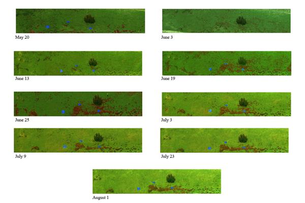 單一時(shí)間圖像分類:在使用這一技術(shù)監(jiān)測(cè)草場(chǎng)的大戟具有一定成效,11幅不同時(shí)間獲取的估算精度是在72%-95%,估算的最佳時(shí)間是在7月初,此時(shí)大戟的開花期到達(dá)頂峰,后期就開始衰老,早期難以辨識(shí)。