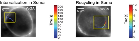 Anke Vermehren-Schmaedick等將BDNF進(jìn)行生物素化,進(jìn)而與鏈霉親合素偶聯(lián)的量子點(diǎn)孵育,從而獲得量子點(diǎn)標(biāo)記物QD-BDNF。通過體外ELISA實(shí)驗(yàn),明確BDNF與量子點(diǎn)的偶聯(lián)沒有影響其與TrkB受體的結(jié)合及活化。在神經(jīng)元細(xì)胞活體成像觀察中,QD-BDNF與TrkB特異性結(jié)合,并誘發(fā)TrkB介導(dǎo)的信號傳導(dǎo);而且,QD-BDNF復(fù)合體可經(jīng)歷長時(shí)間的成像觀察,成像效果優(yōu)于Alexa-BDNF,并且在連續(xù)激發(fā)條件下沒有對細(xì)胞形態(tài)造成不良影響(圖1)。上述研究者利用量子點(diǎn)單分子成像技術(shù),直接觀察到BDNF-TrkB復(fù)合體內(nèi)吞進(jìn)入細(xì)胞漿以及重新回到細(xì)胞膜的再循環(huán)過程(圖2),從而證實(shí)了相關(guān)動(dòng)力學(xué)的推測。