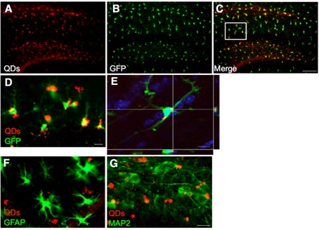 (F) 量子點(diǎn)(紅)沒有被星形膠質(zhì)細(xì)胞(由GFAP抗體標(biāo)記為綠色)攝;