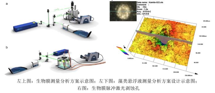 早在2000年,布爾諾科技大學激光光譜學實驗室 Ota Samek 及 Jozef Kaiser博士等即發(fā)表了“Application of laser-induced breakdown spectroscopy to in situ analysis of liquid samples”(Opt.Eng. 39(8) 2248-2262, 2000)。2012年,CEITEC激光光譜學實驗室研究團隊與PSI公司合作,在《Spectrochimica Acta Part B》發(fā)表了“Application of laser-induced breakdown spectroscopy to the analysis of algal biomass for induxrial biotechnology”,該研究利用LIBS技術和特制液體樣品激光作用室,分析了鉀、 鎂、鈣、鈉等與藻類至關重要的元素及銅等毒性重金屬元素積累。實驗設計方案為兩種,一種為利用真空樣品激光作用室對藻類生物膜進行測量分析,另一種利用特制液體樣品激光作用室分析液體中的微藻目標元素(參見下圖)