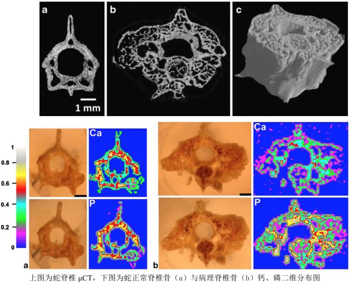 2010年,以Kaiser為代表的激光光譜學實驗室利用LIBS技術結合µCT技術,對蛇的畸形性骨炎脊椎骨元素包括Ca、Al、P、Na 等分布進行了研究分析,并發(fā)表了“Investigation of the osteitis deformans phases in snake vertebrae by double-pulse laser-induced breakdown spectroscopy”(Anal. Bioanal. Chem. 398:1095-1107, 2010)