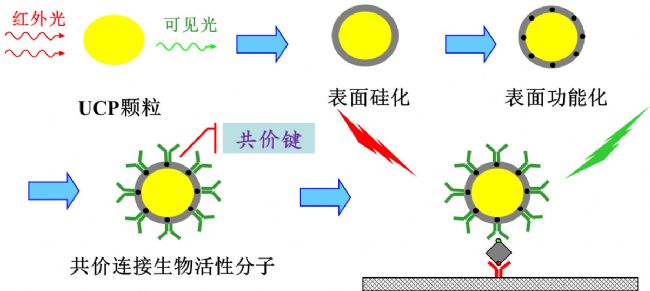 UCP包括3種主要成分:主基質、吸收子和發(fā)射子,由于其獨特的結構,可以出現(xiàn)反Stokes現(xiàn)象,即這種材料可在紅外光區(qū)(波長>780nm)被激發(fā),卻發(fā)射波長遠短于激發(fā)光的可見光(波長為475~670nm),這一現(xiàn)象在自然界中并不存在,其基本原理是雙光子或多光子熒光,即能量上轉。選擇不同的吸收子、發(fā)射子和主基質可使UCP具有不同的光學性質,成為其使用靈活的基礎。