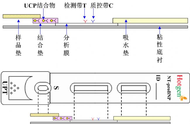 上轉發(fā)光技術與經(jīng)典的免疫層析技術相結合,采用新型標記物——UCP上轉發(fā)光材料,通過掃描分析光電信號,實現(xiàn)對目標抗原或抗體的現(xiàn)場快速檢測。上轉發(fā)光技術試紙條是由UPT與免疫層析共同組成,主要由試紙條以下5個部分組成:樣品墊、結合墊又稱結合物稀釋墊、分析膜、吸水墊、粘性底襯。疊合順序如下圖所示,通過粘膠固定于粘性底襯上。