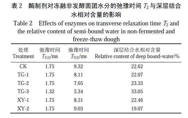 酶制劑對凍融非發(fā)酵面團水分的弛豫時間T2 與深層結(jié)合水相對含量的影響