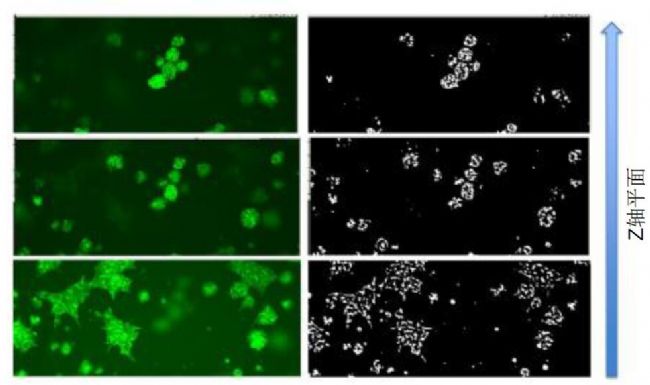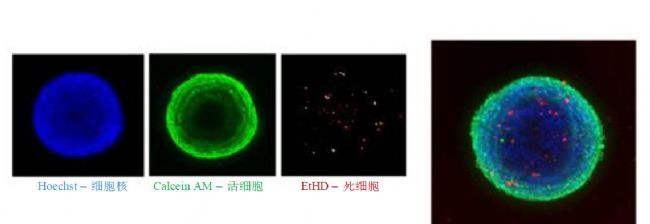 用一個(gè)固定補(bǔ)償值獲取僅僅一張圖像并不足以比較不同大小或形狀的細(xì)胞球,所以采集多個(gè)焦平面上的 圖像是很有必要的。成像方案中采用Hoechst染料對(duì)細(xì)胞球進(jìn)行染色。沿聚焦軸(Z-stack)在不同的焦平面上采 集一系列圖像并合成經(jīng)典的最大投影圖像。