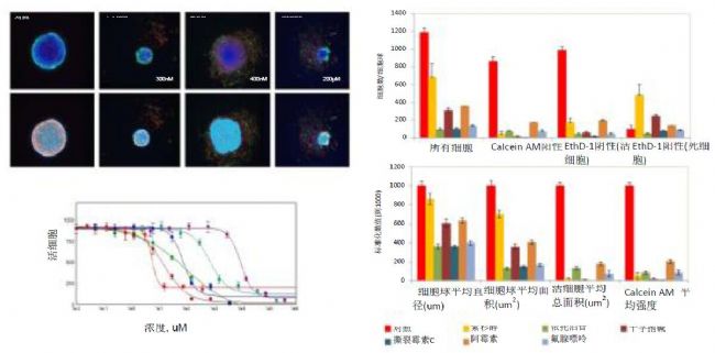 2D和3D分析可對(duì)細(xì)胞球和單個(gè)細(xì)胞做特征描述并提供量化的檢測(cè)數(shù)據(jù),這些數(shù)據(jù)可用于計(jì)算IC50s和各種化合物效力的比較。這一方法的有效性也已通過在384孔板格式下對(duì)一組抗癌藥物的篩選所證明。