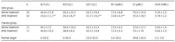 Table 2 Effect of BBR on liver and kidney functions of the subgroup of hypercholesterolemic patients who were not taking other medication before or during BBR treatment.
