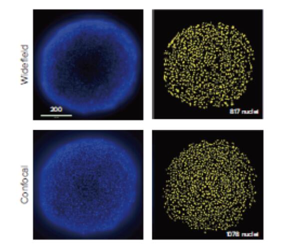 相對于寬場成像,共聚焦可以對球體進行薄層成像,這大大降低了來自于成像平面之外的背景熒光信號的干擾。同時,共聚焦成像也可以在3D水平上更好的分辨亞細胞結(jié)構(gòu)以及腫瘤細胞的聚集和堆疊。運用共聚焦成像技術(shù)還可以完成更精確細胞分割。在腫瘤小球的重復(fù)試驗中,與寬場成像相比,共聚焦成像統(tǒng)計到的細胞核數(shù)要多20%。用寬場成像模式掃描HCT116腫瘤細胞球15層,Bestfocus方式投射為一張2D圖像。通過軟件分析數(shù)出817個細胞核,在邊緣聚焦變形的核和小球內(nèi)部熒光太弱的核都沒有被計數(shù)到。(下)用共聚焦成像模式掃描HCT116腫瘤細胞球15層,Bestfocus方式投射為一張2D圖像。通過軟件分析數(shù)出1087個細胞核,共聚焦的圖像分析出的數(shù)據(jù)更加準(zhǔn)確。