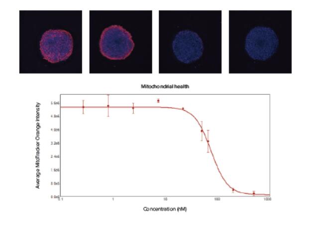在上述的細胞凋亡篩選過程中,我們還可以在混合染料中加入MitoTracker Orange來評估線粒體膜電位。這一方法可以幫助我們研究通過影響線粒體代謝途徑來抑制腫瘤生長的藥物。下面闡述了我們針對抗霉素A,一種線粒體膜電位強力干擾劑,的研究。在經(jīng)過4個小時的處理后,基于MitoTracker Orange的熒光強度我們可以觀察腫瘤微球體細胞中的線粒體狀態(tài)。結(jié)果顯示小球中心部位的紅色熒光很弱,可能是因為MitoTracker 并沒有完全的滲透到小球中心,也可能是位于中心的細胞線粒體已受到損害。細胞小球經(jīng)過一系列濃度的抗菌素A處理: (1,22, 67和200 nM) ,經(jīng)過計算分析,可以得到藥物作用下線粒體平均熒光強度的曲線圖。