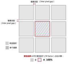 一些品牌的填充因子(Fill factor)占比并沒(méi)有考慮像素間間距(Inter pixel gap),所以通常此項(xiàng)的百分比很高,參數(shù)顯得很“漂亮”(其填充因子占比計(jì)算方法見(jiàn)下圖)。但用戶不了解的是,其實(shí)其Inter pixel gap卻很大,有的甚至高達(dá)1.3μm。