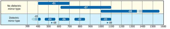 另外,從波長(zhǎng)選型中可以看到,-01到-09這九種型號(hào)中,-01,-07,-08這三種型號(hào)的波長(zhǎng)范圍較長(zhǎng);而-02,-03,-04,-05,-06,-09這幾種型號(hào)的波長(zhǎng)范圍較短,這是因?yàn)樗鼈冊(cè)谝壕У牡讓蛹恿私橘|(zhì)鏡(Dielectric mirror),大大提高了光閾值和光利用率,但也將波長(zhǎng)范圍限制在一個(gè)比較小的范圍內(nèi)。用戶需要根據(jù)應(yīng)用的需求進(jìn)行選擇。