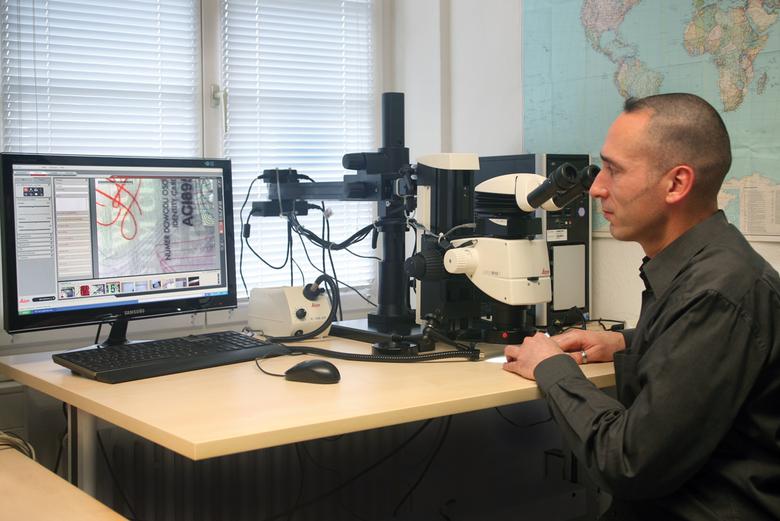 圖 1:對(duì) Martin Fischer — 斯圖加特區(qū)政府文件檢驗(yàn)的專家鑒定人來說,配備 LED 照明裝置、高清照相機(jī)和全高清監(jiān)控器的 Leica M165 C 體視顯微鏡無疑是檢查可疑身份證、簽證和所有類型文件真?zhèn)嗡夭豢缮俚墓ぞ摺?/P> |
