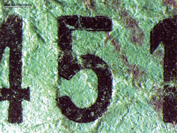 圖 4:這個(gè)序號(hào)是用普通噴墨打印機(jī)印上去的,用肉眼無法清晰辨認(rèn)。 |
