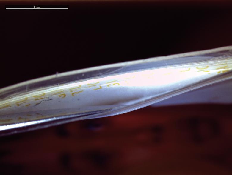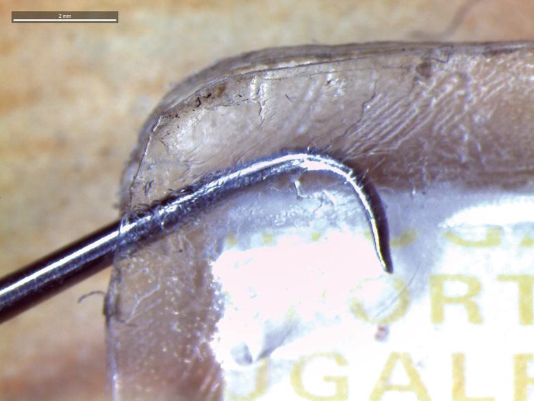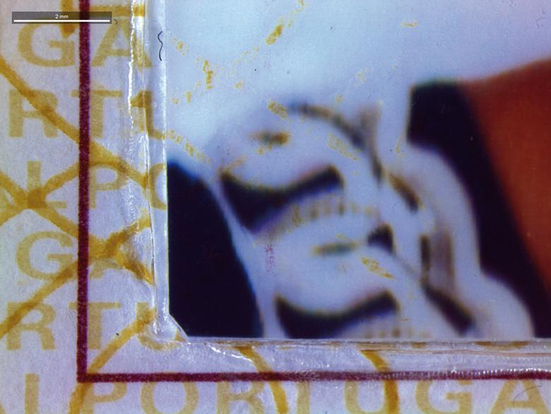 圖 7a:圖片左側(cè)和下面,可以看到一條手工切割的端口。在這里,正版安全防偽箔被切開,原始圖像被移走。隨后,造假者將不同的圖像插入這些端口內(nèi),并用復(fù)合箔進(jìn)行掩蓋。