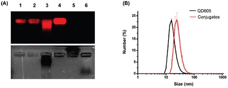 圖1 瓊脂糖凝膠電泳(A)和動(dòng)態(tài)光散射(B)確認(rèn)量子點(diǎn)與愛必妥的偶聯(lián)