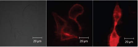 左:體外培養(yǎng)A549細(xì)胞的明場成像;中:量子點(diǎn)-愛必妥偶聯(lián)物與A549細(xì)胞孵育20min;右:量子點(diǎn)-愛必妥偶聯(lián)物與A549細(xì)胞孵育1h。