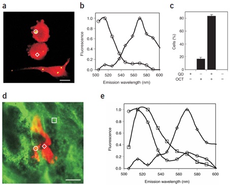 圖1 以量子點(diǎn)對(duì)腫瘤細(xì)胞進(jìn)行細(xì)胞內(nèi)標(biāo)記并在體成像