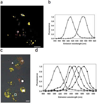 (a) B16F10腫瘤細(xì)胞被標(biāo)記不同量子點(diǎn),混合后經(jīng)尾靜脈注射入小鼠體內(nèi),5h后制備肺組織包埋切片,以發(fā)射掃描多光子顯微鏡對(duì)細(xì)胞成像;(b) 由多光子成像獲得相應(yīng)區(qū)域的發(fā)射光譜掃描數(shù)值(圓形指示510nm量子點(diǎn),菱形指示570nm量子點(diǎn));(c) 以5種不同量子點(diǎn)(510/550/570/590/610nm)分別標(biāo)記腫瘤細(xì)胞,混合后接種于玻片培養(yǎng),以發(fā)射掃描多光子顯微鏡成像;(d) 以10nm帶寬進(jìn)行發(fā)射光譜掃描的數(shù)據(jù)。