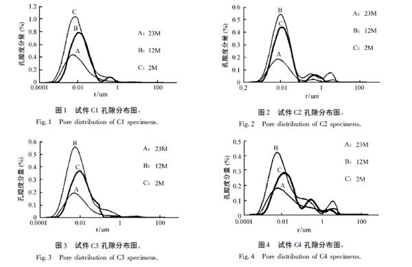 采用核磁共振方法,使用不同磁場強(qiáng)度分別測試了鹽凍試件( C1、C2、C3、C4 組配合比) 的孔隙率 與孔隙分布情況。為對照測試結(jié)果,還采用了稱重法測孔隙率。 |