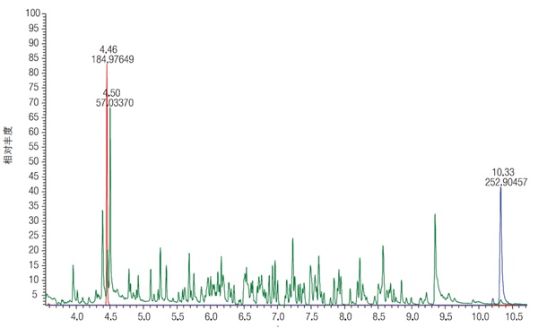 圖 1. 總離子譜圖 (EI 全掃描)和第一個 (敵敵畏,RT = 4.46 min) 及最后一個(溴氰菊酯,RT = 10.33 min) 洗脫的農(nóng)藥的提取離子譜圖(XIC)的疊加圖。對“相對豐度”(Y 軸) 進行了調(diào)整以突出敵敵畏和溴氰菊酯的 XIC 圖。