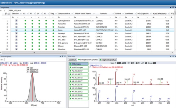 圖 3. 10 ng/g 樣本中確定鑒定出的農(nóng)藥顯示在 TraceFinder 軟件篩查結(jié)果瀏覽器中;衔镒R別和確認(以艾氏劑為例)的依據(jù)是準確質(zhì)量(±2 ppm 質(zhì)量窗口)、 保留時間(RT)、同位素峰分布(IP) 和碎片離子(FI)。圖中可見測定的與理論的同位素峰。