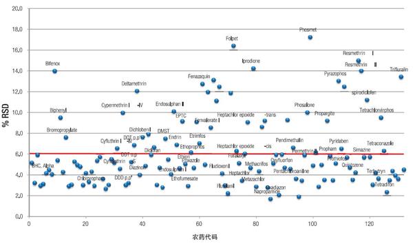 圖 5. 所有 132 種測定的農(nóng)藥在柱上5 或10 pg 濃度水平下的絕對峰面積可重現(xiàn)性 (% RSD,n=10)。圖示為平均 %RSD 值(實線)。