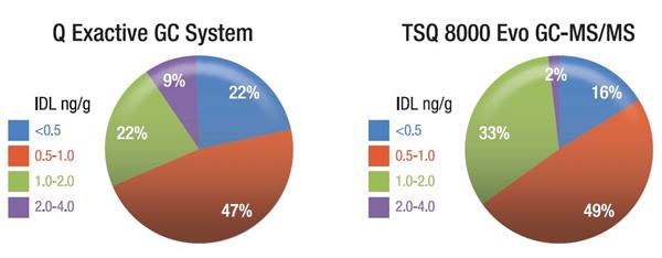 Q Exactive GC 系統(tǒng)農(nóng)殘檢測的所有 IDL 均低于歐盟針對嬰兒食品規(guī)定的典型 MRL。目前絕大部分農(nóng)藥的 MRL 都定為<0.01 mg/kg(10 ng/g)3 。我們還與 Thermo ScientificTM TSQTM 8000 Evo 三重四極桿 GC-MS/MS 系統(tǒng)檢測相同農(nóng)藥的IDL 進行了比較。本次實驗的結(jié)果表明 Q Exactive GC 系統(tǒng)與 TSQ 8000 Evo GC-MS/MS 系統(tǒng)的靈敏度相當,91% 的被測農(nóng)藥 IDL < 2 ng/g (圖 6)。