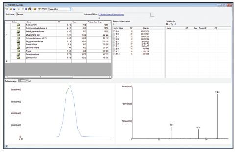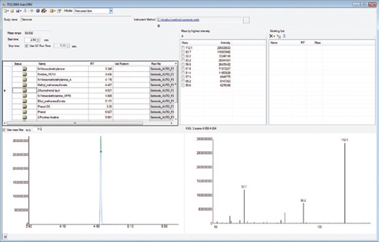 AutoSRM 會通知您的TSQ 8000 系統(tǒng)先對標(biāo)準(zhǔn)品里的化合物進(jìn)行全掃描分析。在得到產(chǎn)物離子譜圖的同時,會同時得到一份豐度最高的幾個產(chǎn)物離子質(zhì)量數(shù)的列表。AutoSRM 還能進(jìn)行手工選擇。