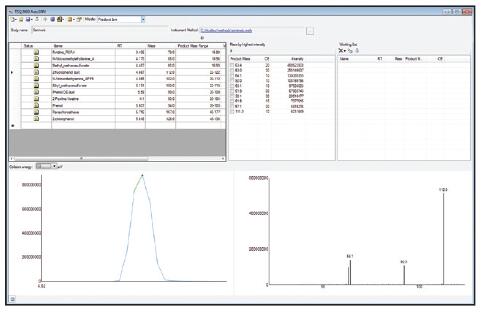 已選定了母離子的質(zhì)量,接著需確定子離子。AutoSRM會指導(dǎo)TSQ 8000 系統(tǒng),對您選定的母離子質(zhì)量在三個碰撞能下進(jìn)行子離子的數(shù)據(jù)采集。期間無需設(shè)置任何方法、序列,或數(shù)據(jù)輸出即可完成這一步。 AutoSRM 會自動處理。在得到您的色譜圖和子離子譜圖的同時,會得到一份列出最高豐度的若干子離子質(zhì)量數(shù)的列表。同樣,AutoSRM 也可以自行決定。至此,可以將離子對列表自動導(dǎo)出到您的儀器方法中,或者也可以手工讓選定的離子對進(jìn)入下面的SRM 優(yōu)化步驟進(jìn)一步優(yōu)化。