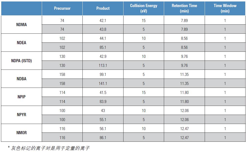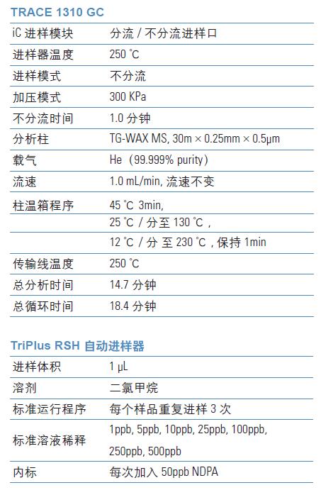 由Munch 和 Bassett 于2004 年建立的EPA 方法521 提供了一個(gè)適應(yīng)當(dāng)時(shí)要求的、基于化學(xué)電離(CI)和帶有內(nèi)部離子化功能的離子阱質(zhì)譜儀的氣質(zhì)聯(lián)用檢測方法,而不是標(biāo)準(zhǔn)的帶有外部離子源的四極桿或離子阱質(zhì)譜儀。如今隨著技術(shù)的發(fā)展,GC-MS 三重四極桿也可以在低分子量區(qū)域提供高靈敏度和高選擇性的分析,使得非常低濃度的亞硝胺檢測,甚至是在復(fù)雜樣品中的低濃度檢測,成為可能。這一可能性源于使用更為簡便的、利用常規(guī)的電子轟擊源(EI)的標(biāo)準(zhǔn)技術(shù),來建立低濃度亞硝胺檢測的便捷方法。